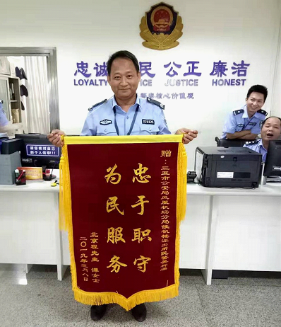 3月17日,北京市民程先生与谭女士将一面印有“忠于职守,为民服务”的锦旗邮寄至三亚市公安局凤凰机场分局候机楼派出所,对辅警吴祥通及时为其找回丢失手机,挽回经济损失表达感激之情。