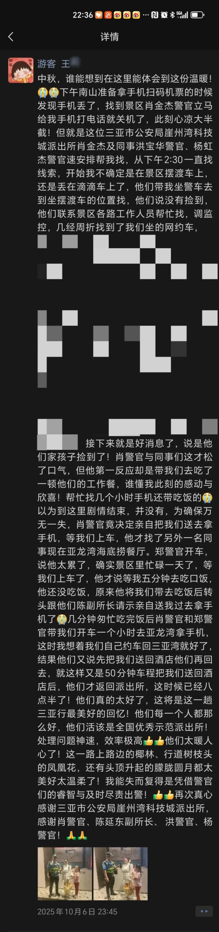“警察同志,我的手机丢了,请帮帮我……”10月6日14时30分许,来自重庆的游客王女士满脸焦急地走进了三亚市公安局崖州分局崖州湾科技城派出所南山旅游警务室,正在执勤的旅游警察肖金养立即上前安抚其情绪,询问情况。经了解,当日,王女士带着女儿从三亚市区打车到南山景区游玩,当其准备拿手机买门票进景区游玩时,发现手机已不见踪影,且已关机,自己也不知道手机是什么时候丢的。手机里保存着珍贵的家庭合照,心急如焚的她第一时间来到警务室寻求帮助。得知情况后,旅游警察洪宝华、杨虹杰驾驶警用电瓶车沿着王女士进景区的路线一路寻找,旅游警察肖金养和郑元冠则发动景区工作人员调阅相关资料寻找线索。经过3个小时的细致查找,他们对景区的接驳车一一进行了排查,均无果,最终锁定了王女士所乘坐的网约车,并与该车驾驶员取得联系,发现王女士下车后不久,其手机被下一名乘客的孩子捡走,现该乘客正在亚龙湾某餐厅。得知手机的下落,王女士悬着的心终于落下。眼看到了饭点,肖金养贴心地为王女士母女俩送上了工作餐。饭后,担心王女士人生地不熟,也没有手机在身上,肖金养和郑元冠又驾车带着王女士母女前往亚龙湾取回手机,再将母女二人送回位于三亚湾的酒店后,方才返回派出所。“谢谢你们,不然我都不知道该怎么办!”临别前,王女士拿着心爱的手机,激动地向肖金养和郑元冠连连道谢。“中秋,谁能想到在这里能体会到这份温暖……谁懂我此刻的感动与欣喜!帮忙找几个小时手机还带吃饭的……他们真的太好了,这将是这一趟三亚行最美好的回忆!……他们太暖人心了!这一路上路边的椰林、行道树枝头的凤凰花,还有头顶升起的朦胧圆月都太美好太温柔了……”当日23时许,王女士难掩内心的激动在微信朋友圈洋洋洒洒写下了1000余字的动态后,安然入睡。