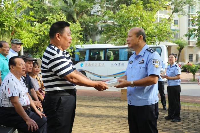 为弘扬中华民族尊老敬老传统美德,进一步增强退休老干部获得感、幸福感、归属感,在重阳节到来之际,三亚市公安局精心组织退休老干部开展系列主题党日活动。此次活动不仅为老干部送上节日关怀,更搭建了“离岗不离责、银发筑平安”银发志愿服务平台,让退休老干部在自贸港建设中绽放别样光彩。活动期间,市公安局党委委员、政治部主任林寿桐看望慰问了退休老干部,为参加重阳节活动的退休老干部送上党的理论书籍,并与他们亲切交谈,了解他们的生活近况,衷心希望老同志们在保重身体的同时,发挥自身优势,积极为三亚公安工作建言献策。带着党组织的温暖关怀,老干部们精神饱满地开始了党日活动,市公安局工会主席、三级高级警长陆安中组织老干部们学习了党的创新理论,重温了入党誓词,围绕“退休干部如何更高效发挥余热”进行座谈,分享经验,就海南自由贸易港封关政策进行了宣讲解读。老干部们表示,将持续关注自贸港建设,积极发挥自身优势,为公安事业与海南自由贸易港建设贡献更多的“银发智慧”。座谈结束后,老干部们身着“银发先锋队”服装前往鹿回头风景区开展登高活动。在欣赏山海风光的同时,联合交管支队、辖区派出所共同开展交通安全与防范电信诈骗宣传活动,通过发放宣传扇子、现场讲解等方式,向市民游客普及交通安全和反诈知识,提升民众安全防范意识。其间,老干部们还走进中国科学院深海科学与工程研究所,了解我国深海科技战略,近距离观摩奋斗者号全海深载人潜水器等重大科研装备模型,参观鲸豚标本馆、观看深海考古等纪录片。此次主题党日活动,让老干部们度过了一个温馨充实的重阳节,更凝聚了“银发力量”。下一步,市公安局将持续做好老干部服务保障工作,鼓励更多的老干部以实际行动践行“银发心向党”的誓言,为海南自贸港建设添砖加瓦。