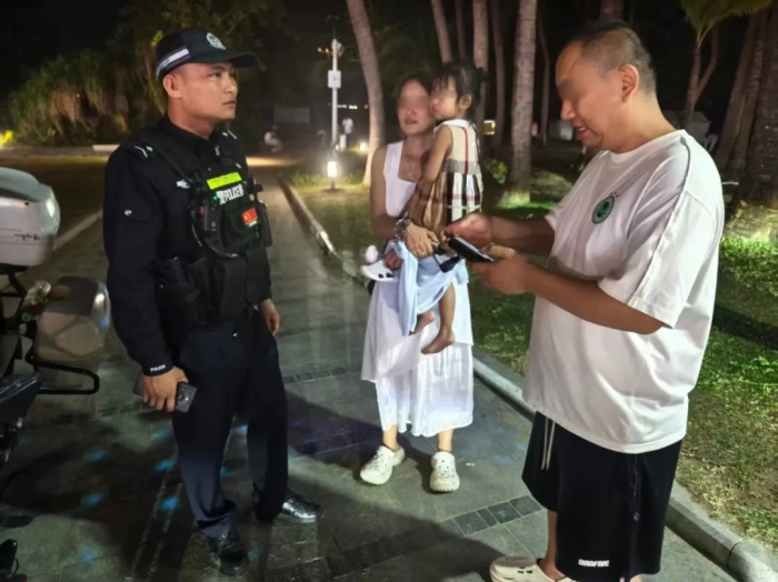 接警后,执勤队员苏海涛、麦忠武立即赶到现场,一边安抚家属情绪,一边以走失点为中心开展地毯式搜寻。经过近一个小时寻找,苏海涛成功在三亚湾海边7号公厕附近发现一名独自徘徊的小女孩。