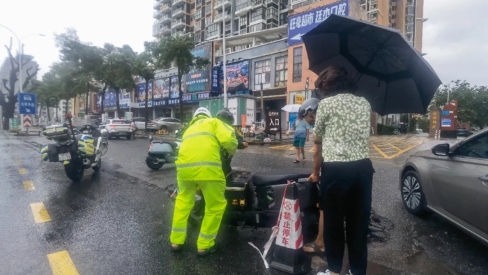 9月28日上午,交管支队天涯大队执勤交警巡逻至金鸡岭路段时,发现一名外卖小哥被风吹倒在地,交警立即上前将其扶起,并叮嘱其台风天注意安全,减少外出。风雨中,三亚公安民辅警既是守护者,也是暖心人。各公安分局联合社区、村居、物业排查广告牌、高空悬挂物等隐患,开展防风宣传,筑牢群防群治防线。交警在积水路段指挥疏导,徒手清理阻塞道路排水口杂物,帮助群众将抛锚车辆推离积水路段,引导车辆安全通行,用实际行动诠释“人民公安为人民”的庄严承诺。