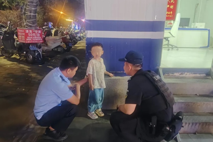 特警支队海棠大队巡逻组在乐天城帮助一名走失孩童寻回父母。