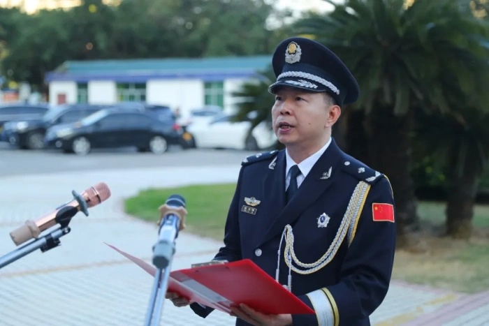上午8时,升旗仪式正式拉开帷幕,护旗手高擎旗帜,步伐铿锵,护卫着警旗稳步走向升旗台。伴随着激昂嘹亮的《中国人民警察警歌》,警旗徐徐升起,全体民辅警面向警旗庄严敬礼。在迎风飘扬的旗帜下,陈志伟带领全体同志重温《公安机关人民警察誓词》,誓言铿锵、响彻全场,宣示着三亚公安队伍全力护航海南自贸港建设,忠实履行新时代使命任务的坚定信念和坚强决心。